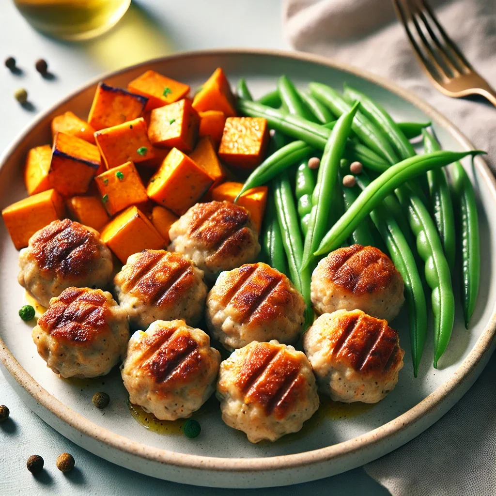 Kyllingefrikadeller med søde kartofler og grønne bønner